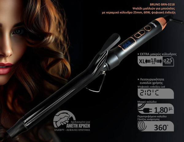 BRUNO BRN-0218 Ψαλίδι μαλλιών για μπούκλες με κεραμικό κύλινδρο 25mm, 60W, ψηφιακή ένδειξη, black-copper