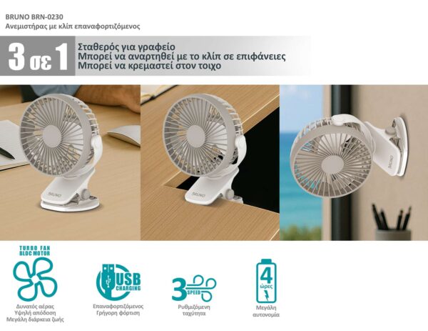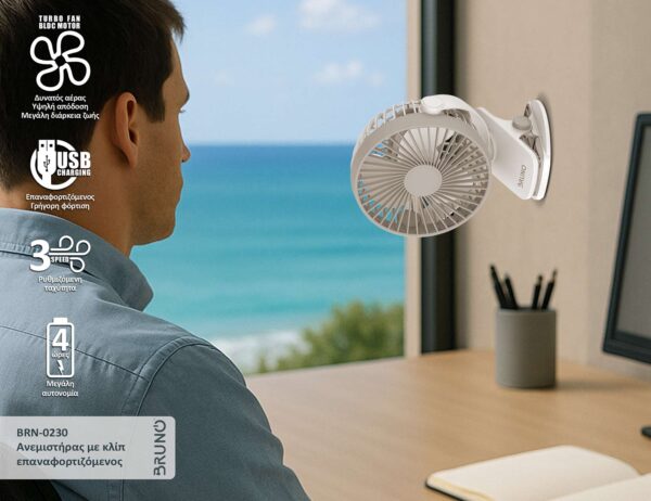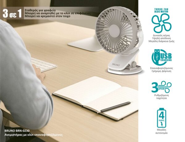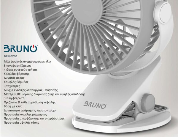 BRUNO BRN-0230 Ανεμιστήρας με κλίπ επαναφορτιζόμενος, λευκός-γκρί