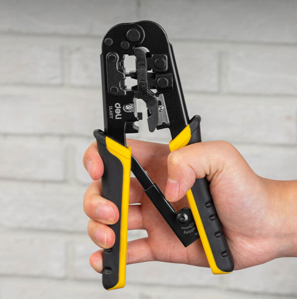Πολυλειτουργική πρέσα ακροδεκτών καλωδίων της Deli ιδανική για κοπή, απογύμνωση και πρεσάρισμα ακροδεκτών σε καλώδια δικτύου