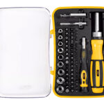 Σετ κατσαβιδιών ακριβείας της Deli το οποίο αποτελείται από 2 κατσαβίδια, 2 επεκτάσεις και 61 διαφορετικές κεφαλές και εξαρτήματα κατσαβιδιού.