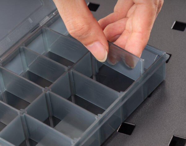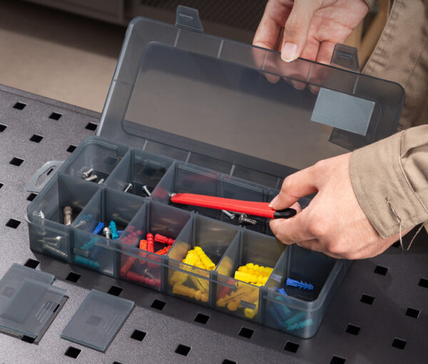 Πλαστική ταμπακιέρα 12 θέσεων της Deli, ιδανική για την αποθήκευση βιδών, καρφιών, παξιμαδιών, ασφαλειών ή άλλων μικρών εξαρτημάτων.
