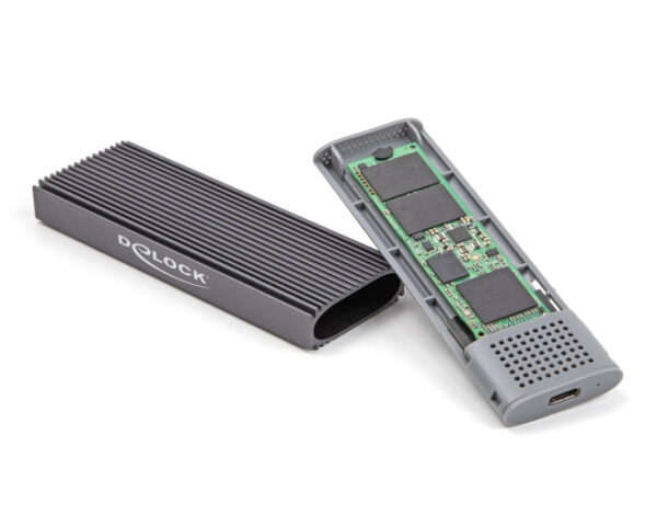 Αυτή η θήκη της Delock μπορεί να χρησιμοποιηθεί για την σύνδεση ενός M.2 PCIe NVMe SSD ή SATA M.2 SSD με έναν επιτραπέζιο ή φορητό υπολογιστή μέσω θύρας USB-C.