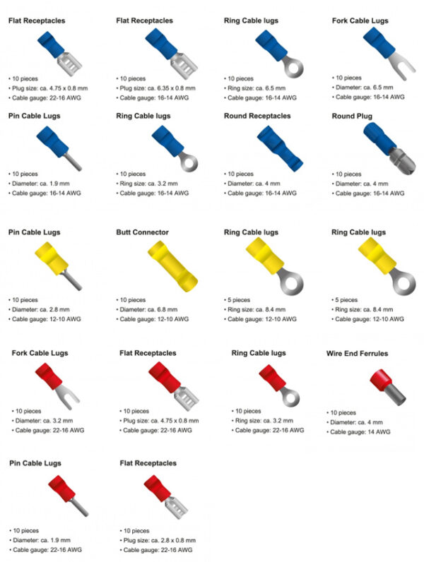 Σετ ακροδεκτών καλωδίων 170 τεμαχίων με μόνωση, ιδανικό για κάθε ηλεκτρολογική εργασία. Σε πλαστική κασετίνα, με χωριστά διαμερίσματα για εύκολο διαχωρισμό και ευκολία χρήσης.