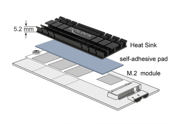 This heat sink by Delock can be used for heat dissipation of an M.2 module and can be fixed with the attached self-adhesive thermal pads to the M.2 module