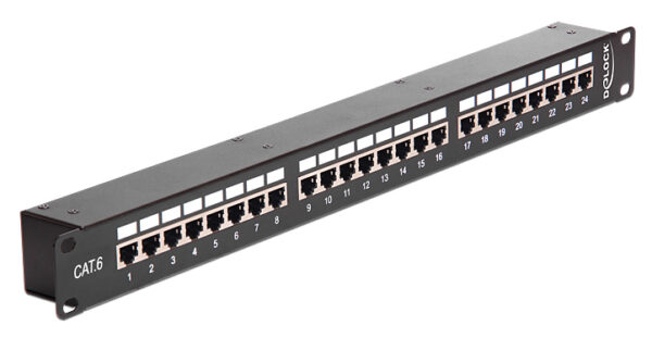 Patch panel της Delock που μπορεί να τοποθετηθεί σε 19" rack. Οι υποδοχές στο μπροστινό και πίσω μέρος του panel παρέχουν βολικές συνδέσεις για 24x RJ45 καλώδια στο μπροστινό μέρος και 24x RJ45 καλώδια στο πίσω μέρος.