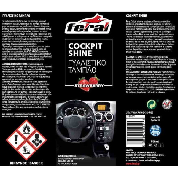 Το γυαλιστικό ταμπλό Feral, είναι ένα προϊόν με μοναδική σύνθεση που γυαλίζει, προστατεύει και συντηρεί τα πλαστικά μέρη του αυτοκινήτου σας χαρίζοντας εκπληκτική λάμψη, και μοναδικό άρωμα. Τα αντιστατικά συστατικά που περιέχει καθώς και οι εξαιρετικής ποιότητος σιλικόνες απωθούν την σκόνη παρατείνοντας έτσι την λάμψη της επιφάνειας. Προστατεύει από το ξεθώριασμα, το σκάσιμο και την αφυδάτωση των εσωτερικών επιφανειών του αυτοκινήτου. Ιδανικό για χρήση σε βινύλια, πλαστικά και ελαστικά μέρη όπως ταμπλό αυτοκινήτων, φορτηγών, λεωφορείων και προφυλακτήρες. Οδηγίες χρήσης: 1)Ανακινήστε καλά το μπουκάλι και έπειτα ψεκάστε ομοιόμορφα την πλαστική επιφάνεια από απόσταση 15-20 εκ. 2)Σκουπίστε το με μαλακό πανί ώστε γυαλίσει. 3)Επαναλάβετε όσο συχνά επιθυμείτε.
