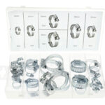 Σετ της GEKO που αποτελείται από 26 μεταλλικούς σφιγκτήρες για λάστιχα, σε διάφορα μεγέθη. Όλα τα εξαρτήματα του σετ είναι τοποθετημένα μέσα σε διάφανη πλαστική θήκη για την εύκολη τακτοποίηση και μεταφορά τους.
