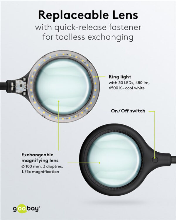 Μεγεθυντικός φακός της Goobay διαμέτρου 100mm, με 3 διόπτρες και μεγέθυνση 1.75x. Διαθέτει φωτιστικό δακτύλιο με 30 SMD LED υψηλής απόδοσης για άνετη εργασία ακόμη και σε σκοτεινά μέρη. Ο βραχίωνας του είναι εύκαμπτος γεγονός που προσφέρει μεγαλύτερη ευελιξία κατά την διάρκεια των εργασιών σας.