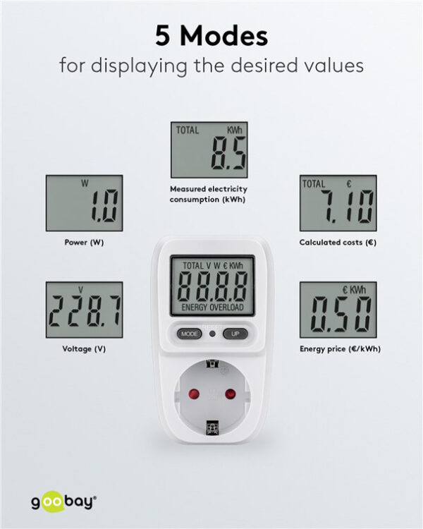 Μετρητής της Goobay για τη μέτρηση της κατανάλωσης ρεύματος των συνδεδεμένων οικιακών ηλεκτρικών συσκευών. Ενσωματώνει ευανάγνωστη οθόνη που σας επιτρέπει να παρακολουθείτε την κατανάλωση του ρεύματος αλλά και το κόστος σε ευρώ/kWh. Η ανάγνωση των δεδομένων μπορεί να γίνει σε πραγματικό χρόνο αλλά και μακροπρόθεσμα εφόσον παραμείνει συνδεδεμένη στην πρίζα η ηλεκτρική συσκευή.