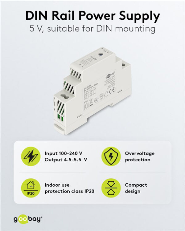 Τροφοδοτικό της Goobay με απόδοση έως 12W, κατάλληλο για θυροτηλέφωνα, συστήματα ασφαλείας, συστήματα αυτοματισμού κ.α. Η τοποθέτηση του γίνεται εύκολα σε DIN ράγα TH 35/7.5 ή TH 35/15.