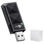 Card reader σε μέγεθος USB flash από την Goobay, με υποδοχή στην οποία μπορείτε να τοποθετήσετε μια SD κάρτα μνήμης. Συνδέεται απευθείας σε desktop ή laptop μέσω θύρας USB.