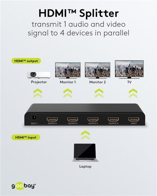 Το HDMI splitter της Goobay σας επιτρέπει την σύνδεση 1x συσκευής εισόδου όπως PC σε 4x συσκευών εξόδου όπως οθόνες.