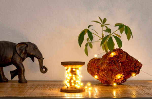 LED φωτιστικό σε σχήμα καρούλι νήματος, κατασκευασμένο με herbal raw υλικά, με όψη ξύλου, ιδανικό για την διακόσμηση του χώρου σας. Αποτελείται από 100 micro LEDs με θερμοκρασία χρώματος 2700K, που δημιουργούν ένα εντυπωσιακό εφέ και μπορούν να χρησιμοποιηθούν και ανεξάρτητα από την βάση.