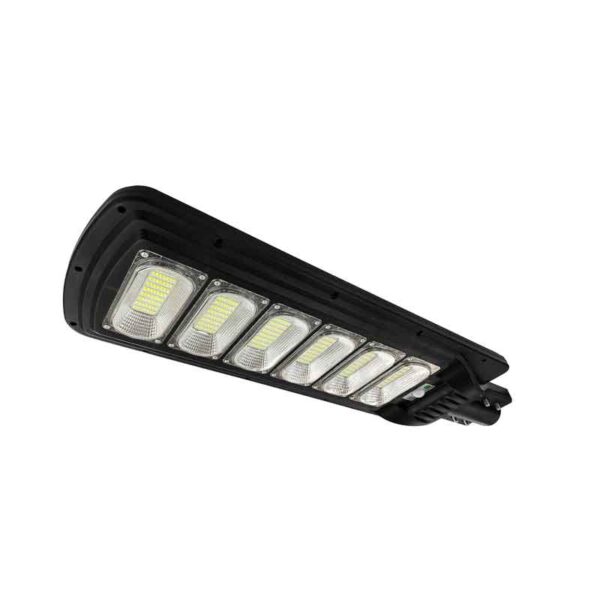 Ηλιακό φωτιστικό δρόμου σε μαύρο χρώμα, που συγκεντρώνει και αποθηκεύει ηλιακή ενέργεια για τη λειτουργία του, ώστε να μη χρειάζεται να συνδεθεί σε παροχή ρεύματος. Διαθέτει ανιχνευτή κίνησης για να ενεργοποιείται όταν εντοπίσει κίνηση εντός της εμβέλειάς του. Περιλαμβάνει τηλεκοντρόλ ώστε να το χειρίζεστε από απόσταση.