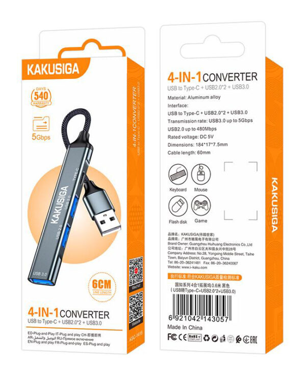 Αυτό το hub της KAKUSIGA μπορεί να συνδεθεί με το laptop ή το desktop σας μέσω θύρας USB και να επεκτείνει τις θύρες του με 1x USB-C και 3x USB θύρες. Διαφορετικές συσκευές USB, όπως εξωτερικοί σκληροί δίσκοι, card readers, ποντίκια κλπ. μπορούν να συνδεθούν μέσω του hub.