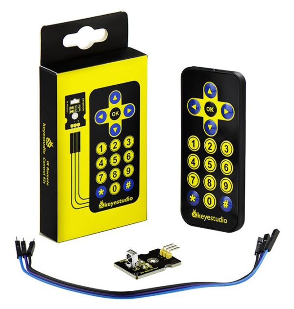 IR receiver module kit της Keyestudio για Arduino. To kit αποτελείται από 1 εξαιρετικά λεπτό ασύρματο χειριστήριο 17 πλήκτρων λειτουργίας, IR receiver module 38KHZ και καλώδιο 3-Pin dupont line θηλυκό σε αρσενικό.