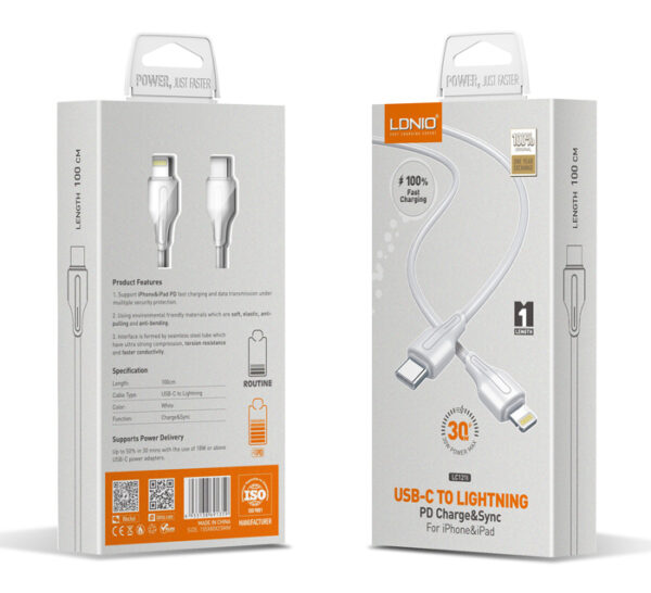 LDNIO καλώδιο Lightning σε USB-C LC121I, 30W PD, 1m, λευκό
