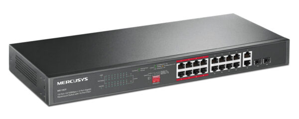 Το rackmount switch της Mercusys σας επιτρέπει να επεκτείνετε το ενσύρματο δίκτυο σας με 16x 10/100Mbps PoE+ θύρες και 2x Gigabit θύρες.