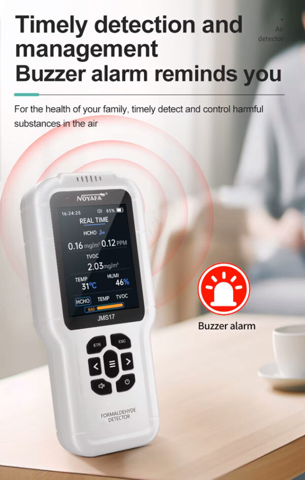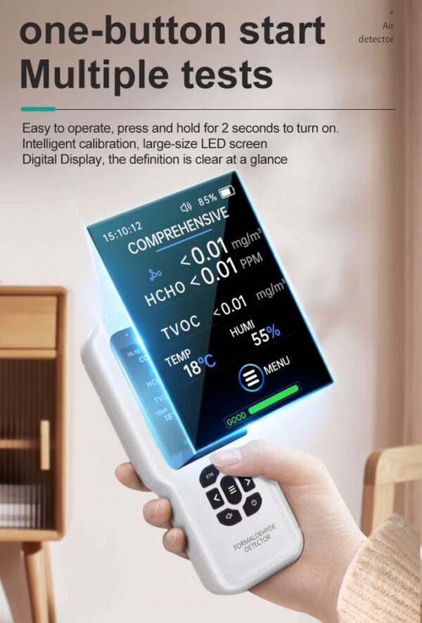 -Real-time measurement: HCHO (mg/m3 PPM), TVOC (mg/m3), temperature (°C) and humidity (%)