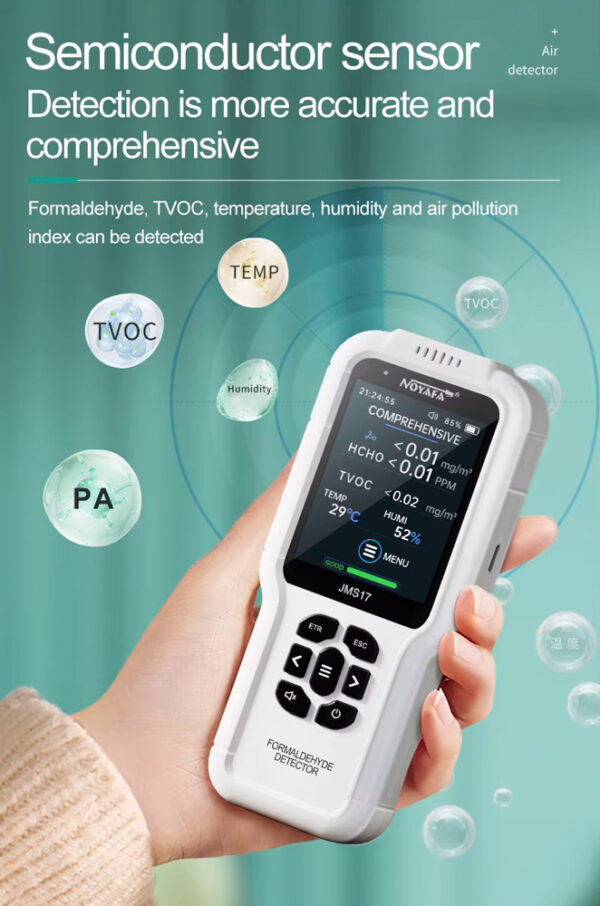 Το JMS17 είναι ένα χρήσιμο εργαλείο που μπορεί να μετρήσει ταυτόχρονα την ποιότητα του αέρα (μετρώντας τη συγκέντρωση της φορμαλδεΰδης και της οργανικής ύλης), τη θερμοκρασία και την υγρασία περιβάλλοντος.