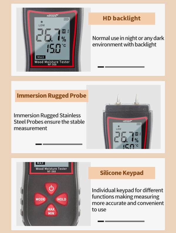 Το NF-568 είναι ένα εξαιρετικό εργαλείο για τη μέτρηση της περιεκτικότητας υγρασίας σε ξύλο, χαρτί, bamboo και άλλα υλικά από ξύλο.