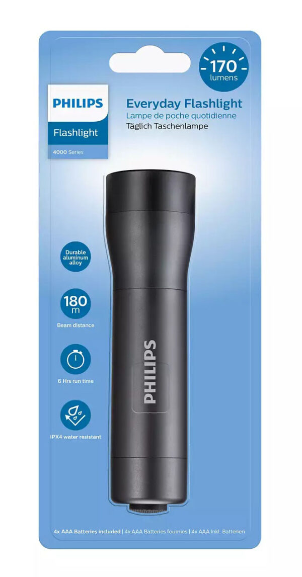 Ελαφρύς και φορητός φακός LED SFL4001T απο την Philips. Ο LED φακός καθημερινής χρήσης, καλύπτει τις ανάγκες σας για φως μέσα αλλά και έξω από το σπίτι. Ιδανική λύση για να τον έχετε πάντοτε κοντά σας μέσα στο σπίτι ή στην εργαλειοθήκη σας. Το μικρό του μέγεθος τον καθιστά εύχρηστο και λειτουργικό κάτω απο όλες τις συνθήκες. Τεχνολογία LED που παρέχει άπλετο φως με ελάχιστη κατανάλωση. Παρέχει φωτεινότητα 170 lumens με έως και 6 ώρες αυτονομίας με 4 μπαταρίες ΑΑA (συμπεριλαμβάνονται στην συσκευασία). Ελαφρύς και ανθεκτικός, φτιαγμένος απο κράμα αλουμινίου και με πιστοποίηση IPX4 για να αντέχει σε νερό και υγρασία. Η ακτίνα του μπορεί να φωτίσει έως και τα 180 μέτρα.