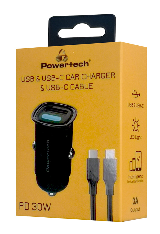 Υψηλής απόδοσης φορτιστής αυτοκινήτου της Powertech, συμβατός με συσκευές που φορτίζουν μέσω θύρας USB. Διαθέτει USB και USB-C θύρες εξόδου που υποστηρίζουν φόρτιση με μέγιστη απόδοση 30W.