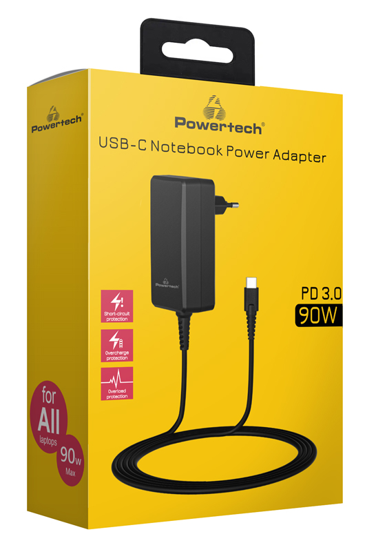 Φορτιστής τοίχου της Powertech για την φόρτιση laptop μέσω θύρας USB-C. Υποστηρίζει πρωτόκολλο γρήγορης φόρτισης PD 3.0 με μέγιστη απόδοση έως 90W.