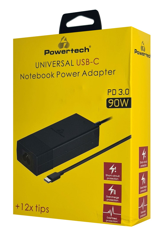 Φορτιστής laptop της Powertech με 12 διαφορετικά βύσματα τροφοδοσίας που προσφέρουν συμβατότητα με τα περισσότερα laptop της αγοράς. Υποστηρίζει πρωτόκολλο γρήγορης φόρτισης PD 3.0 με μέγιστη απόδοση έως 90W.