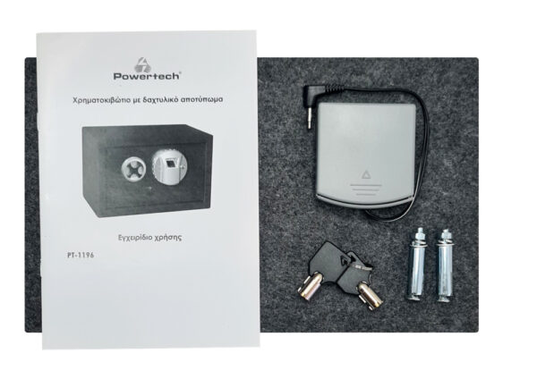 Επιπλέον, στη συσκευασία συμπεριλαμβάνεται εξωτερικό κυτίο μπαταριών για back up τροφοδοσία σε περίπτωση που τελειώσει η μπαταρία του χρηματοκιβώτιου και δεν βρίσκετε τα κλειδιά ασφαλείας.