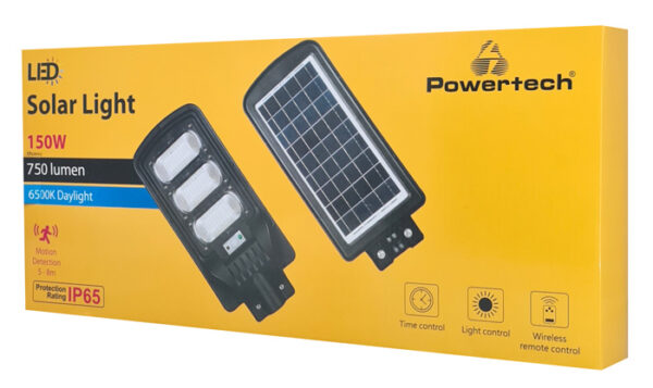 LED ηλιακός προβολέας εξωτερικού χώρου της Powertech με ισχύ 150W. Ενσωματώνει αισθητήρα κίνησης με εμβέλεια ανίχνευσης έως 8 μέτρα και αισθητήρα φωτός που επιτρέπει την αυτόματη ενεργοποίηση του φωτιστικού την νύχτα και απενεργοποίηση του την ήμερα.