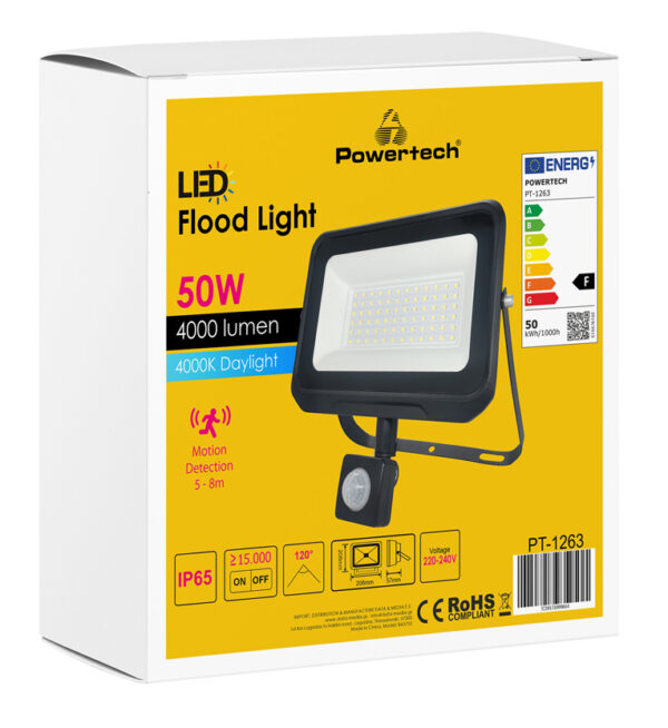 Powertech LED προβολέας εξωτερικού χώρου με ισχύ 50W, φωτεινή ροή 4000 lumens και αισθητήρα κίνησης PIR με οπτικό πεδίο ανίχνευσης 120°.