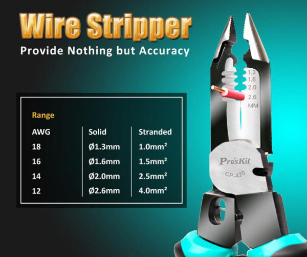 Πολυλειτουργική πένσα της PROSKIT, κατάλληλη για την απογύμνωση και διαχωρισμό καλωδίων, κοπή συρμάτων, πτύχωση τερματικών και σύσφιξη παξιμαδιών.