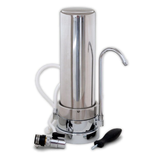 Συσκευή φιλτραρίσματος νερού σε ανοξείδωτο μεταλλικό περίβλημα, προσαρμόζεται στη βρύση με ανταλλακτικό φίλτρο ενεργού άνθρακα για κάθε τύπο βρύσης, εξαιρετικής ποιότητας.