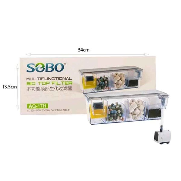 Το SOBO AQ‑17H είναι ένα συμπαγές, κορυφαίας τοποθέτησης (top‑mount) φίλτρο για ενυδρεία, σχεδιασμένο για αποδοτική πολυβάθμια φίλτρανση (μηχανική και βιολογική) και βελτιωμένη οξυγόνωση μέσω καταρράκτη με υδροτροχό. Ακολουθούν μερικά βασικά χαρακτηριστικά και πλεονεκτήματα: