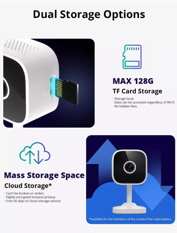 Η αποθήκευση των αρχείων γίνεται σε cloud λογαριασμό ή κάρτα μνήμης micro SD (δεν συμπεριλαμβάνεται).