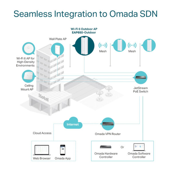 -Τεχνολογία Omada Mesh: Επιτρέπει την ασύρματη σύνδεση μεταξύ των access point για εκτεταμένη εμβέλεια και ευέλικτη ανάπτυξη.