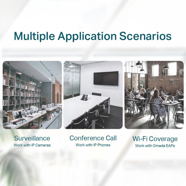 Είναι πλήρως συμβατό με συσκευές όπως κάμερες IP, access points τηλέφωνα IP, υπολογιστές, εκτυπωτές και IPTV.
