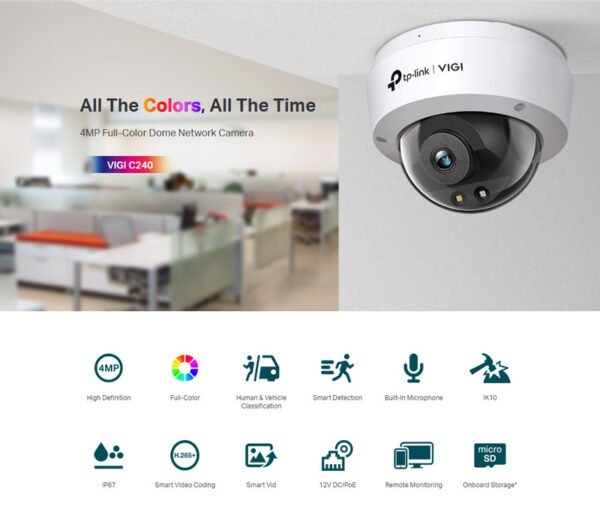 Δικτυακή κάμερα της TP-LINK με φακό 2.8mm και αισθητήρα ανάλυσης 4MP. Υποστηρίζει έγχρωμη νυχτερινή όραση, τροφοδοσία PoE, καταγραφή σε κάρτα micro SD (δεν συμπεριλαμβάνεται) και εξοπλίζεται με εσωτερικό μικρόφωνο για μεταφορά ήχου.