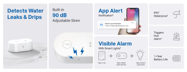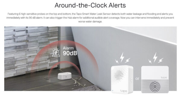 Με 6 ενσωματωμένους ανιχνευτές υψηλής ευαισθησίας, ο smart αισθητήρας πλημμύρας Tapo T300 της TP-LINK ανιχνεύει αποτελεσματικά την διαρροή νερού. Σε περίπτωση ανίχνευσης διαρροής, σας ειδοποιεί με ηχητικό συναγερμό, ενώ, ακόμη και αν δεν βρίσκεστε στο σπίτι, σας αποστέλλει άμεσες ειδοποιήσεις στο smartphone σας, μέσω της εφαρμογής TP-Link Tapo.
