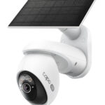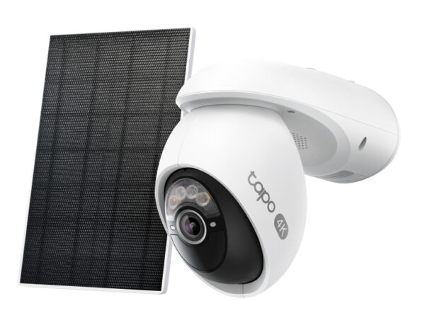 Smart ηλιακή κάμερα εξωτερικού χώρου της TP-Link με εικόνα ανάλυσης 4K και ενσωματωμένο μικρόφωνο και ηχείο που επιτρέπει την αμφίδρομη μεταφορά φωνής και ήχου.