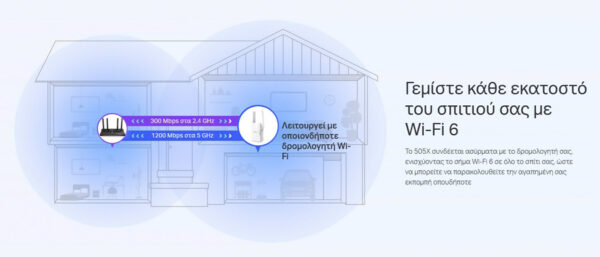 Το RE505X είναι εξοπλισμένο με την τελευταία ασύρματη τεχνολογία, Wi-Fi 6, για υψηλότερες ταχύτητες, μεγαλύτερη χωρητικότητα και μειωμένη συμφόρηση δικτύου. Δημιουργεί ένα δίκτυο Mesh συνδέοντας σε ένα δρομολογητή OneMesh για απρόσκοπτη κάλυψη σε ολόκληρο το σπίτι.