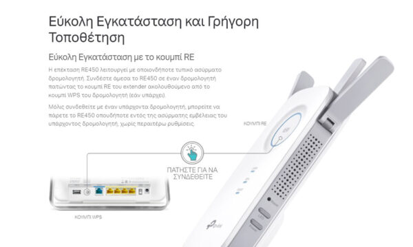 Έχετε κουραστεί από νεκρές ζώνες Wi-Fi στο σπίτι σας; Το RE450 Range Extender συνδέεται ασύρματα με το router Wi-Fi, ενισχύοντας και επεκτείνοντας το σήμα του έως και 1.115 τετραγωνικά μέτρα. Με ταχύτητες έως 450Mbps στα 2,4GHz και 1300Mbps στα 5GHz, αντικαταστήστε τις νεκρές ζώνες με ισχυρό, γρήγορο Wi-Fi σε κάθε δωμάτιο.