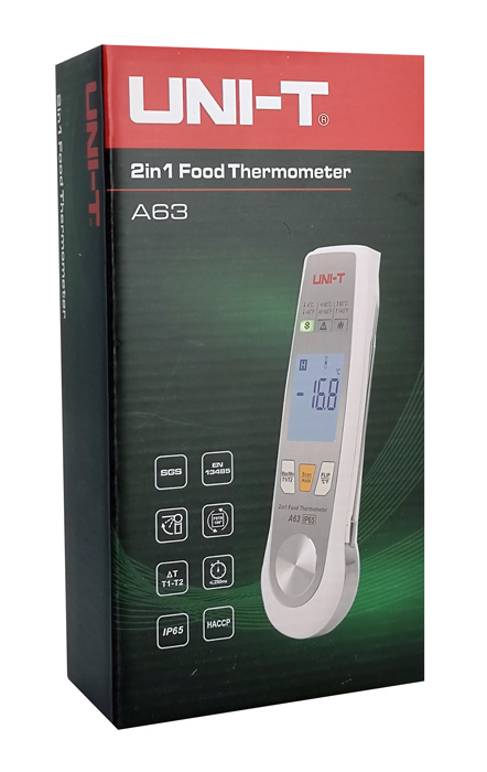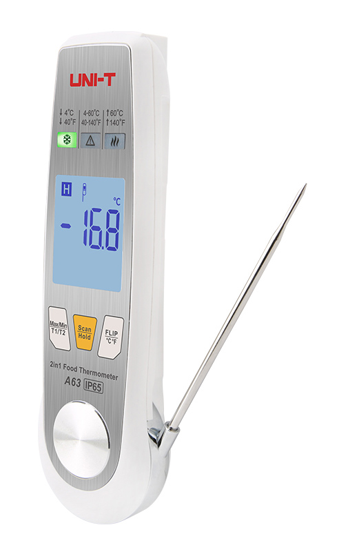 Το A63 είναι ένα θερμόμετρο τροφίμων με αισθητήρα υπερύθρων και πτυσσόμενο αισθητήρα. Παρέχει μια ιδανική λύση μέτρησης και παρακολούθησης της θερμοκρασίας για επαγγελματίες στη βιομηχανία τροφίμων. Ο αισθητήρας υπερύθρων μπορεί να σαρώσει γρήγορα τη θερμοκρασία επιφάνειας των τροφίμων ενώ ο πτυσσόμενο αισθητήρας μπορεί να χρησιμοποιηθεί για την μέτρηση της θερμοκρασίας στο εσωτερικό του τροφίμου. Διαθέτει δείκτη φωτός για το εύρος θερμοκρασίας, λειτουργία που το καθιστά ιδανικό HACCP (Hazard Analysis and Critical Control Point) επιθεώρηση, για τη διασφάλιση της ασφάλειας των τροφίμων. Είναι κατάλληλο για βιομηχανίες επεξεργασία, μεταφοράς και αποθήκευσης τροφίμων, για καταστήματα εστίασης κ.α.