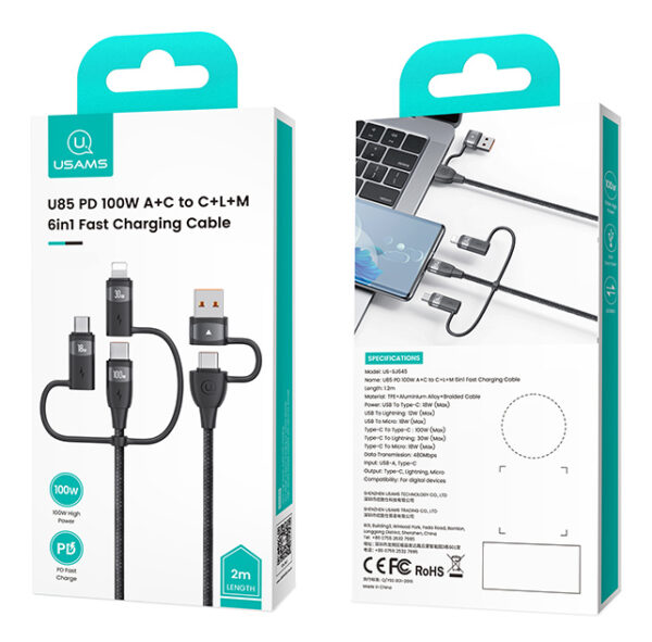 Multi port καλώδιο USB και USB-C σε USB-C, Lightning και micro USB από την Usams. Υποστηρίζει φόρτιση με απόδοση έως 100W και μεταφορά δεδομένων με ταχύτητα έως 480Mbps.